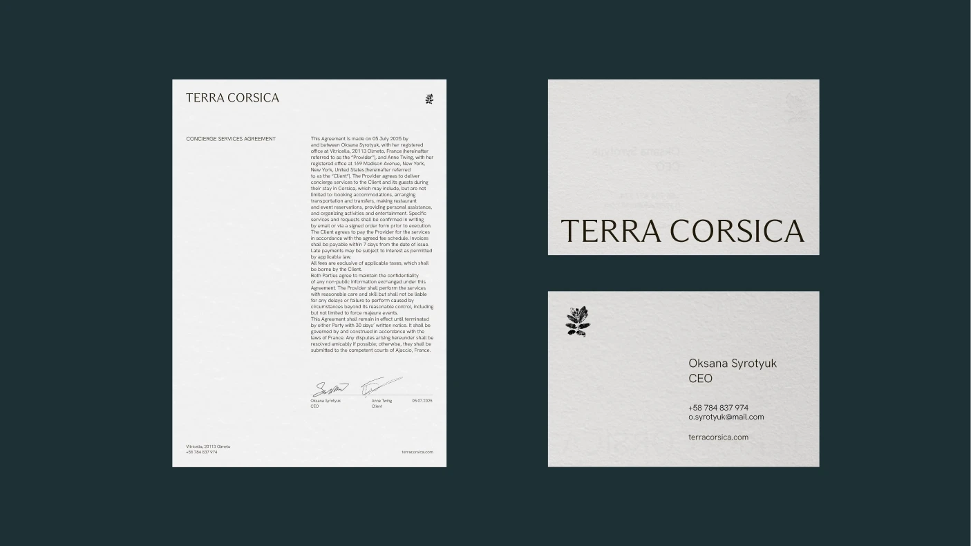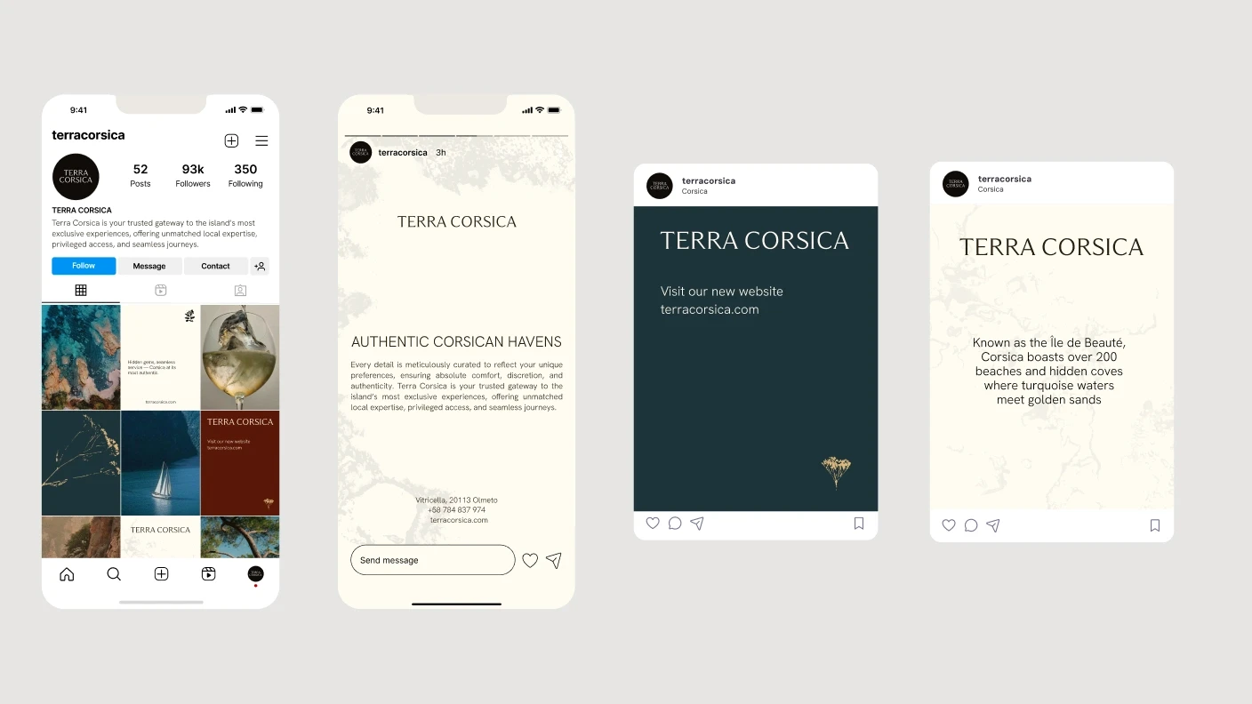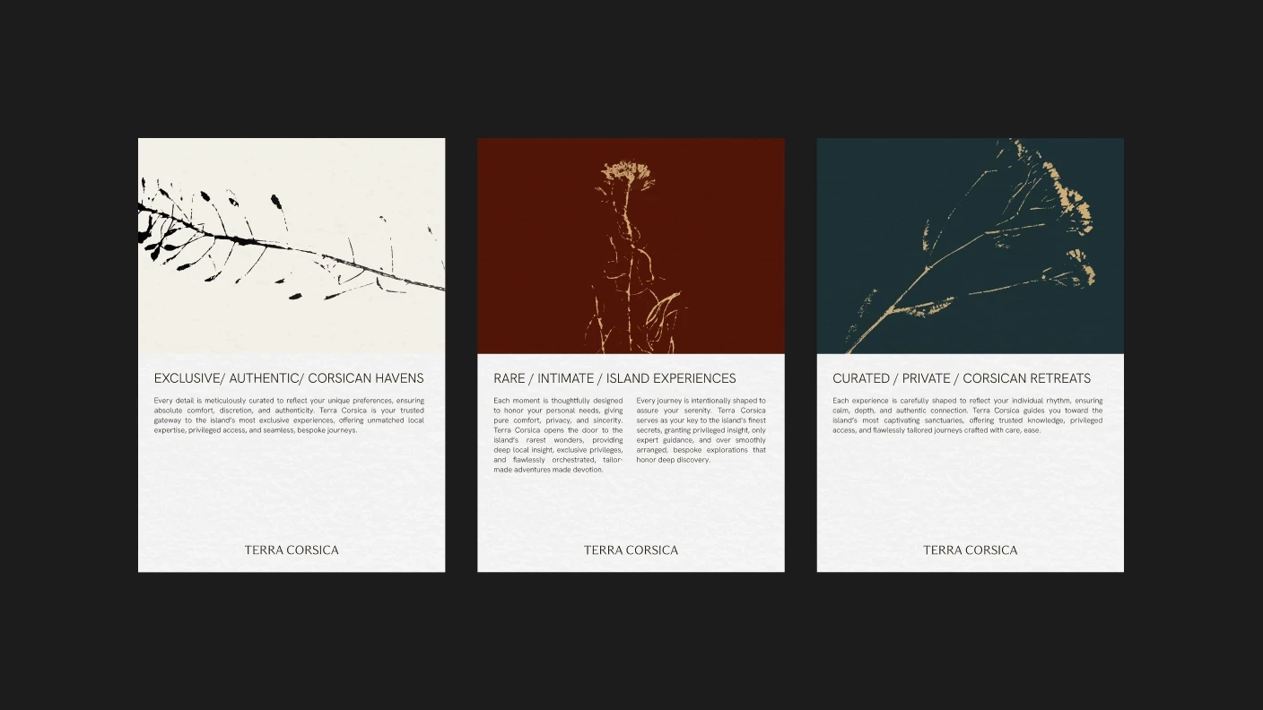 The brand’s vision is to curate meaningful island moments through personalized guidance, refined taste and deep local insight. The identity reflects Corsica’s natural character through tactile elements, organic forms and a calm, understated typographic rhythm.